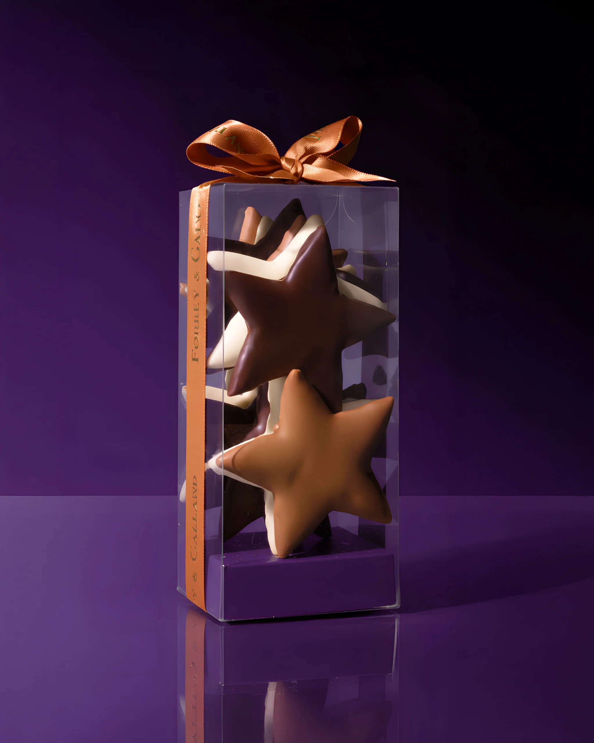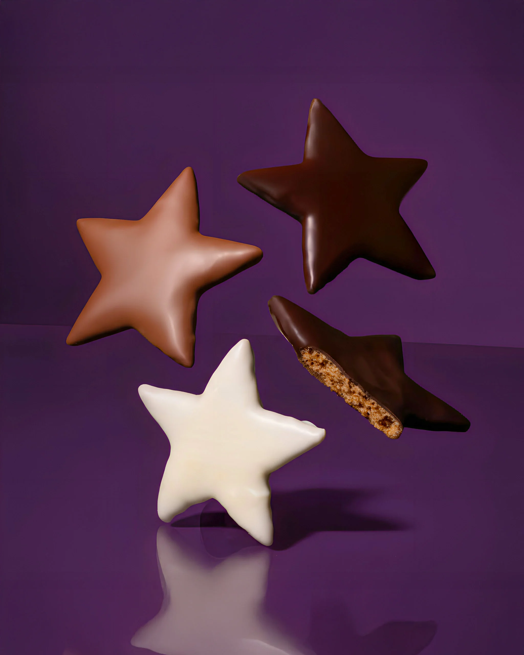 An irresistible assortment of star cookies dipped in milk, dark, and white chocolate, crafted for moments of festive sharing.