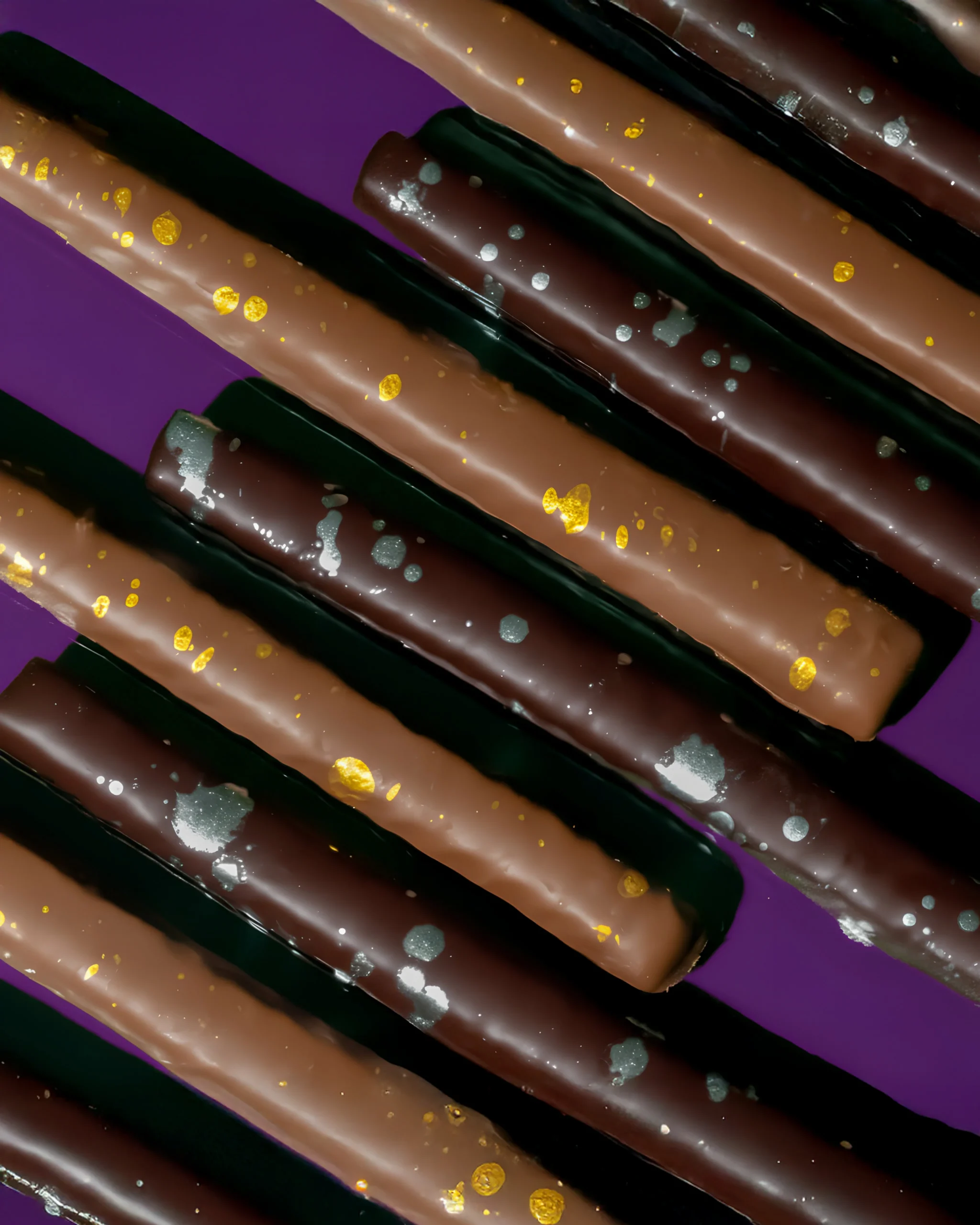 Crisp chocolate batons infused with notes of ginger and spice, the perfect complement to a cup of coffee or hot chocolate.