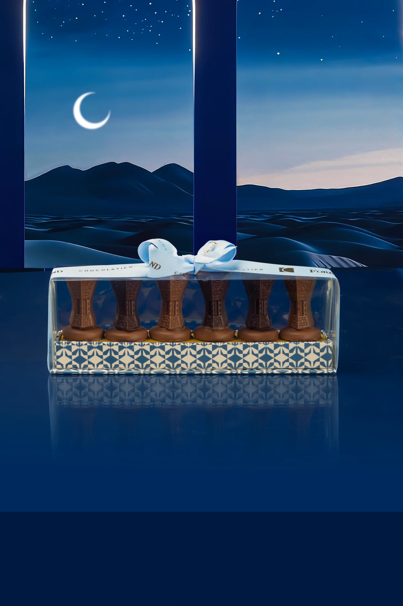 An elegant assortment of bakhoor-shaped chocolates paired with a delicate chocolate-dipped vanilla sablé base, curated for refined tasting moments and graceful gifting.