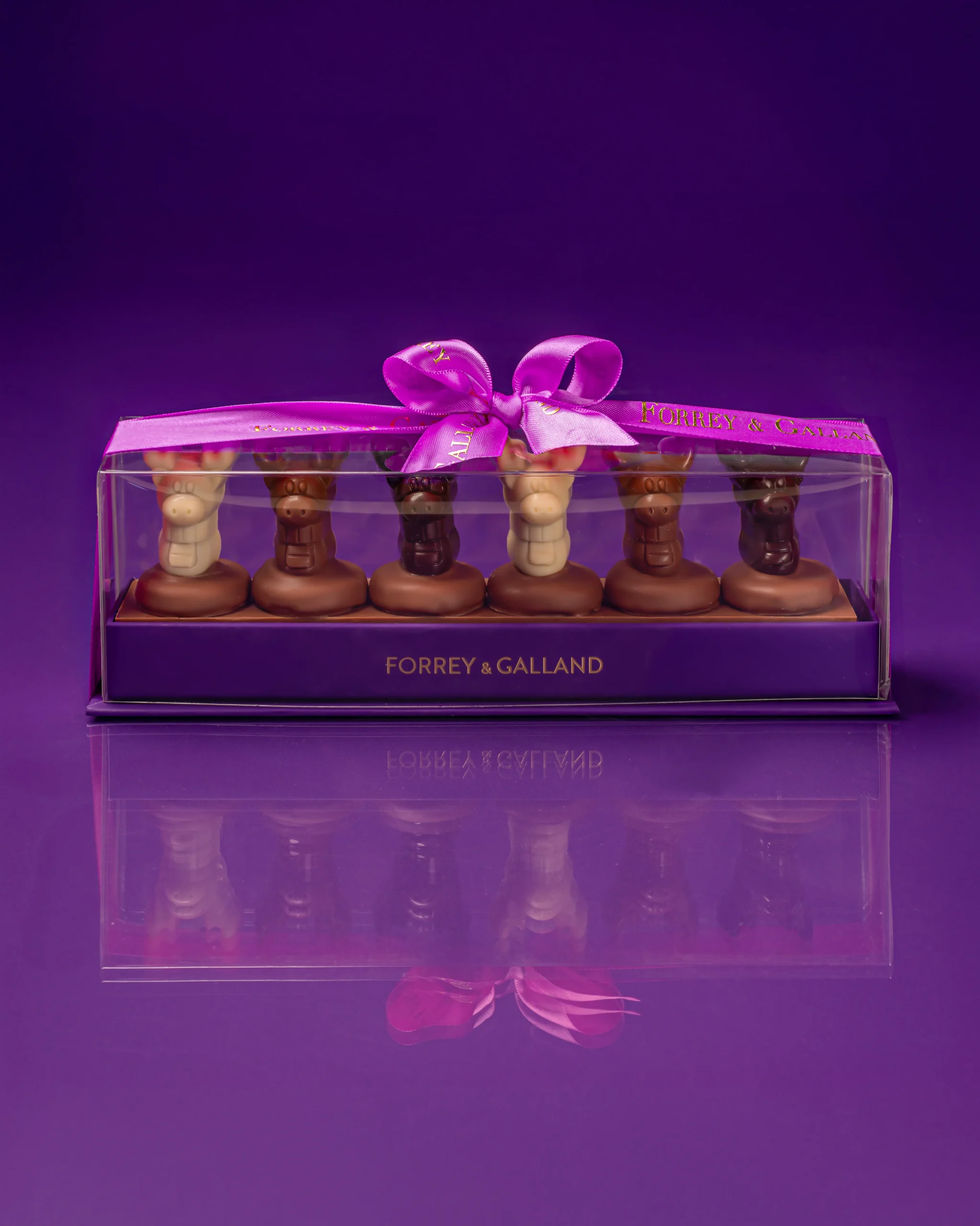 A charming festive assortment featuring our handcrafted mini reindeers in milk, dark, and white chocolate, each set on a crisp vanilla sablé base. A petite box that adds a refined touch of holiday joy to any celebration.