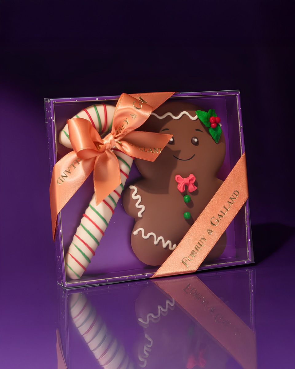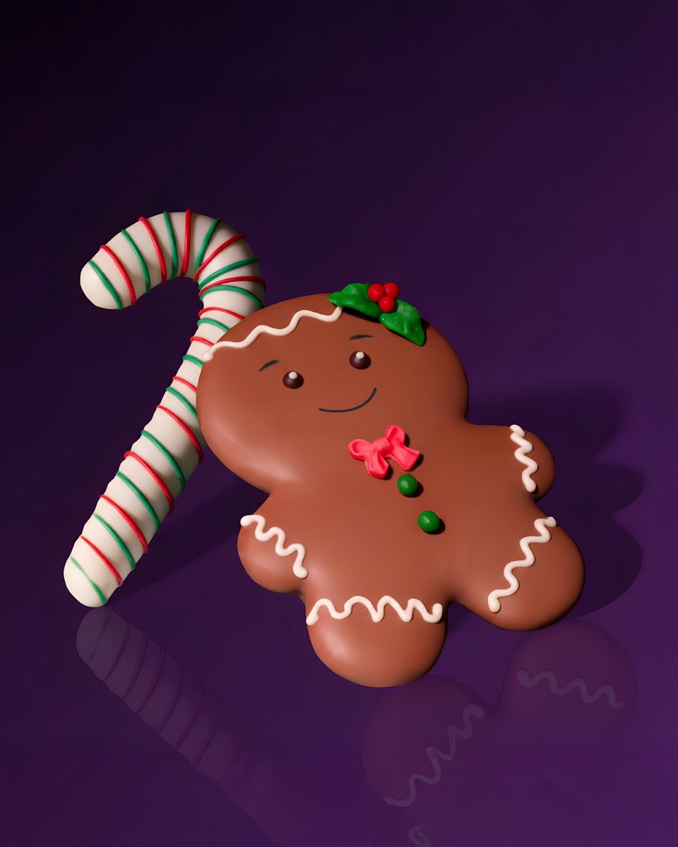 Our signature festive icon, a soft gingerbread cookie dipped in milk chocolate paired with a candy cane, hand-decorated with icing details.