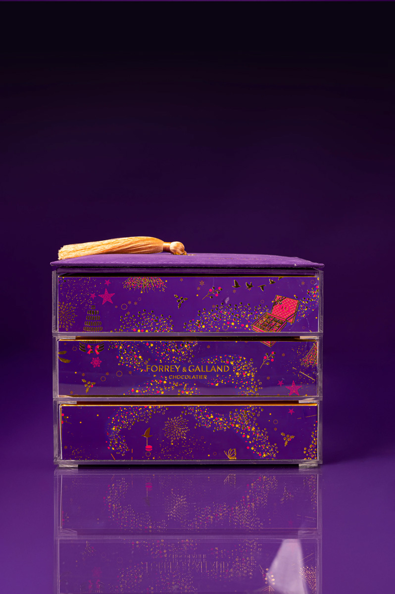 An elegant three-tier masterpiece celebrating the spirit of gifting. From rich pralines and silky truffles to festive cookies and sablés. crafted to delight every sense.