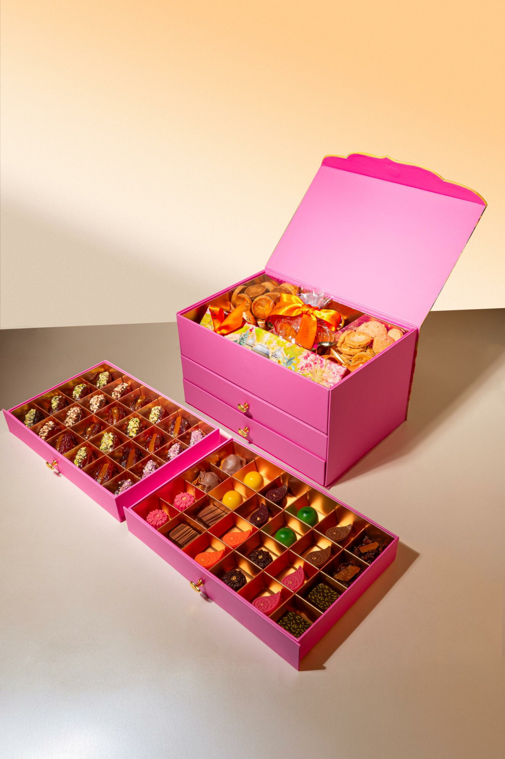 Flavours: Signature Rangoli pralines, rose-kissed marzipans, nut-filled gianduja, buttery sablé flower chocolates, and an assortment of filled dates.
