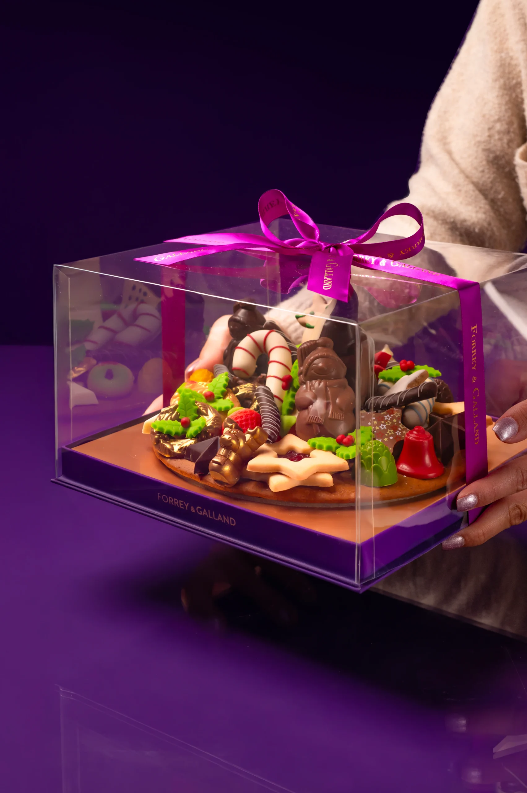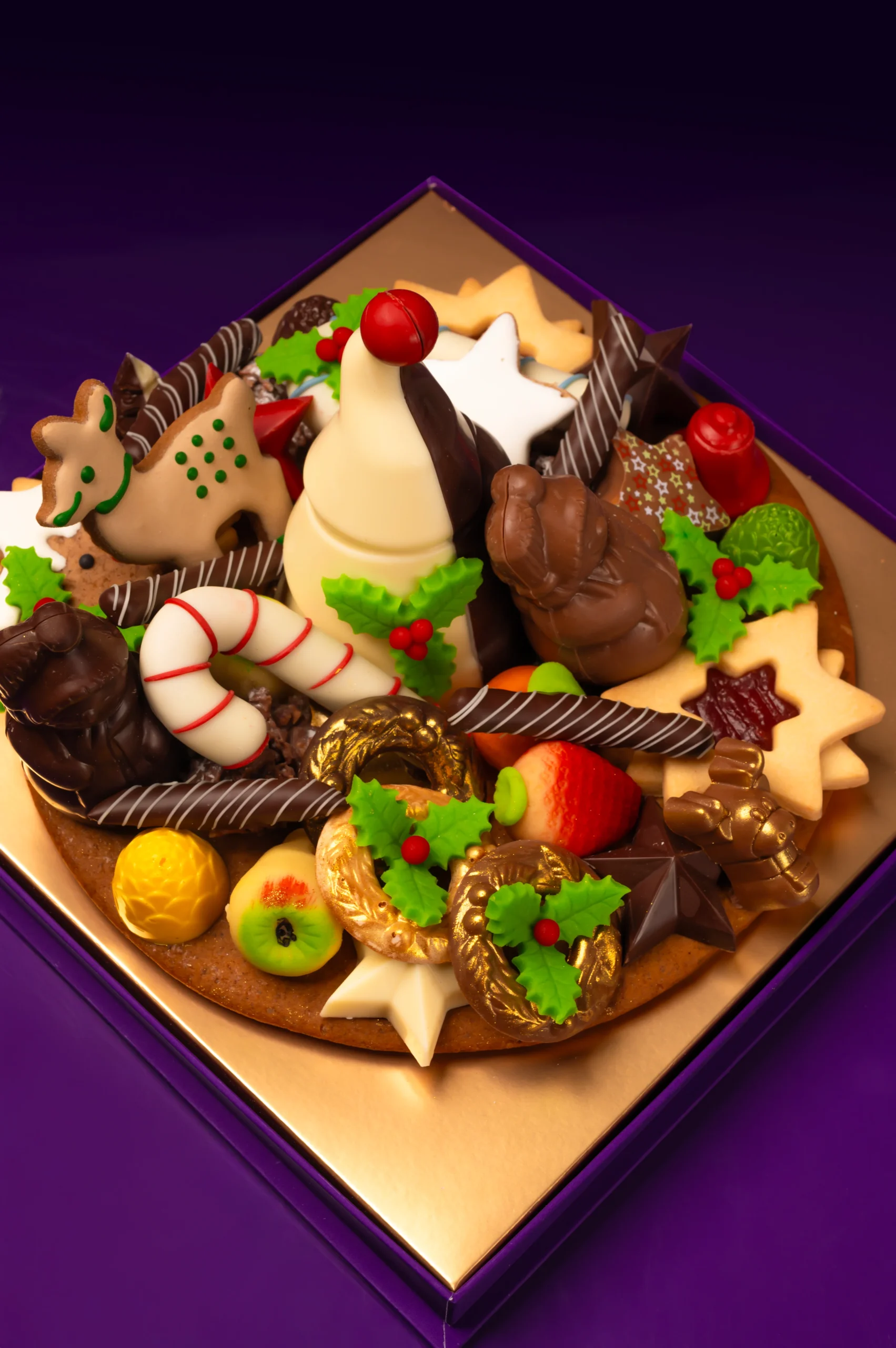 A festive showpiece of handcrafted chocolates, marzipan fruits, cookies arranged on a buttery sablé base. From chocolate Santas and snowmen to candy canes and spiced stars, each piece celebrates the joy of the season.