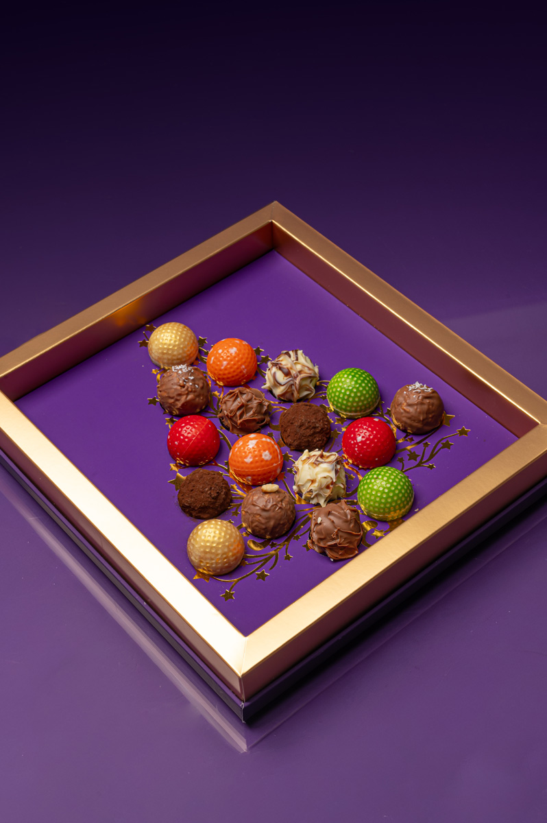 An elegant assortment of handcrafted truffles, each one bursting with flavour and festive charm. From nutty praline and zesty orange to velvety coconut and rich Madagascar chocolate.