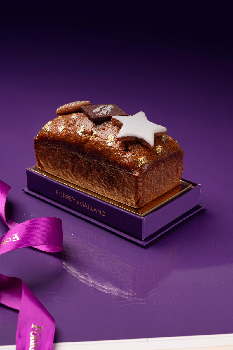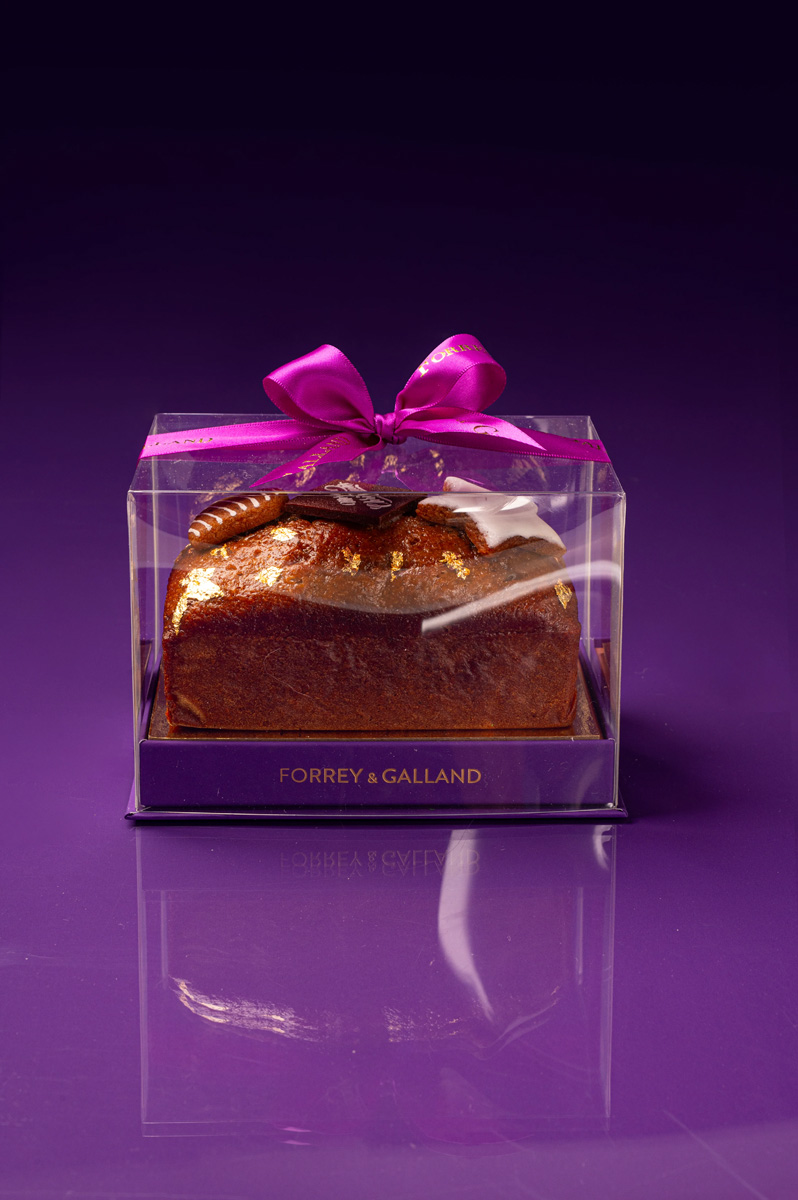 A festive favourite, soft gingerbread cake enriched with warm spices, honey, and a hint of cocoa, finished with chocolate décor.