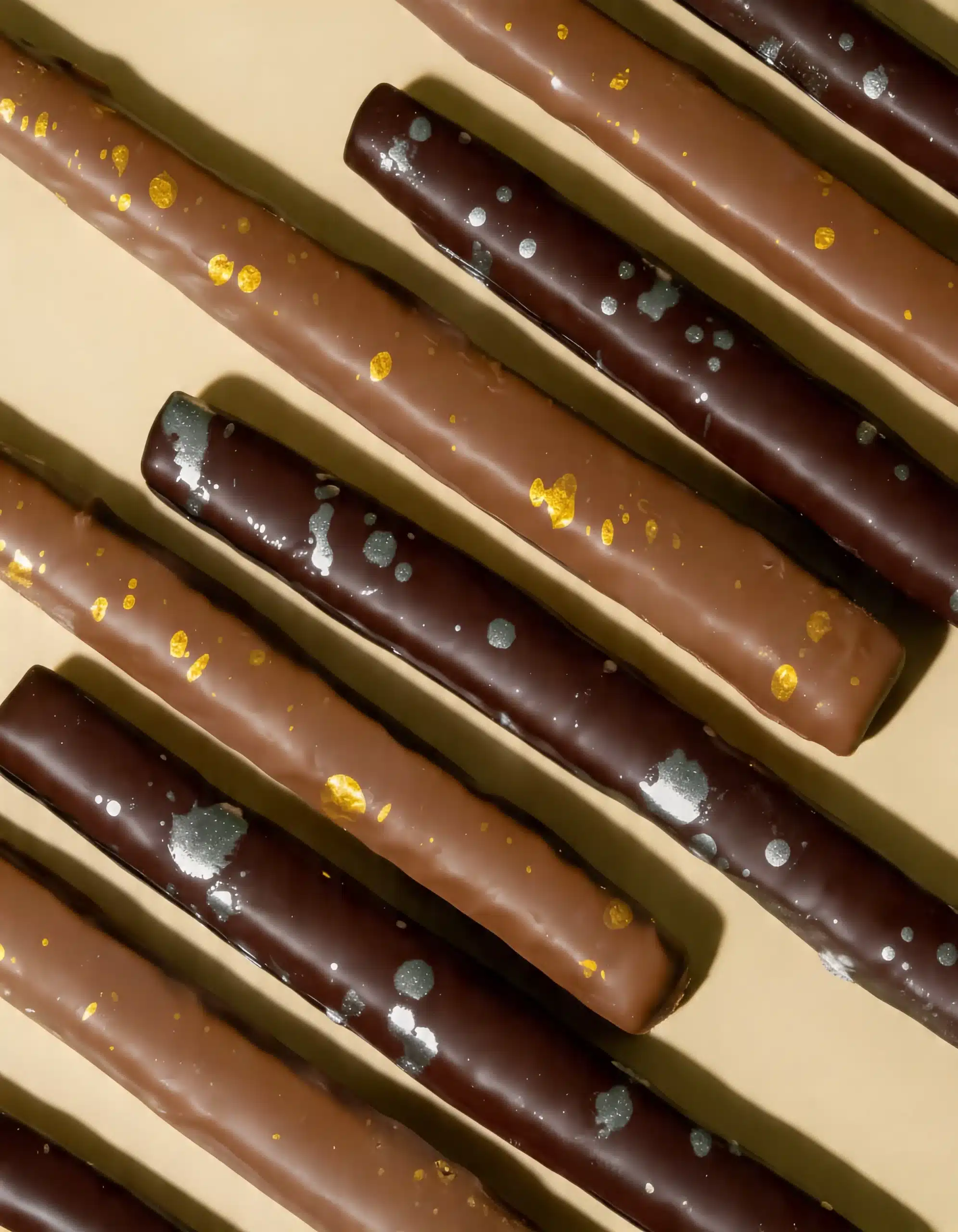 An elegant assortment of gingerbread cookie sticks, delicately spiced and coated in smooth milk and dark chocolate, each finished with subtle gold detailing.