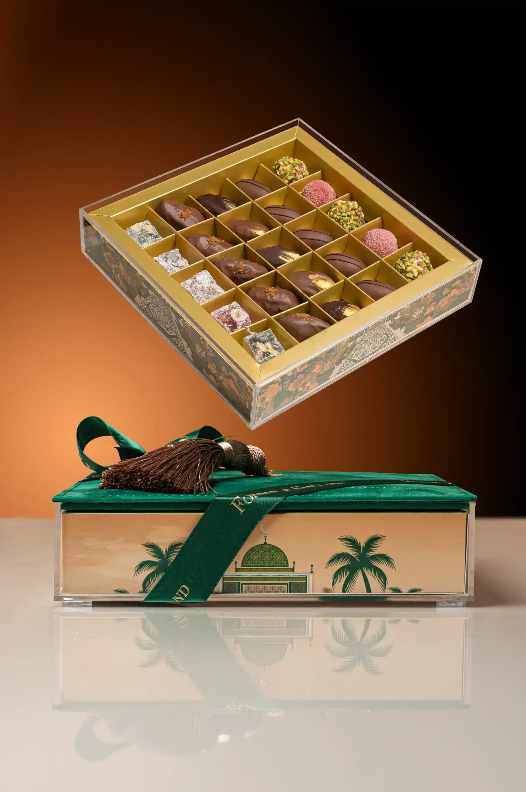 Layer 1: Artisanal chocolates: Sheep-shaped chocolates with Pistachio Kunafa – Milk, Rahash Kunafa – Dark, Coconut Ganache – White, Passion Fruit Ganache – Yellow, Classic Collection with Halawa Truffle, Florentine, Dark Rocher Gavotte, Karak flavoured Dates, Milk Nougatine Ganache, Dark Omani Halawa, Earl Grey, Cappuccino Ganache.