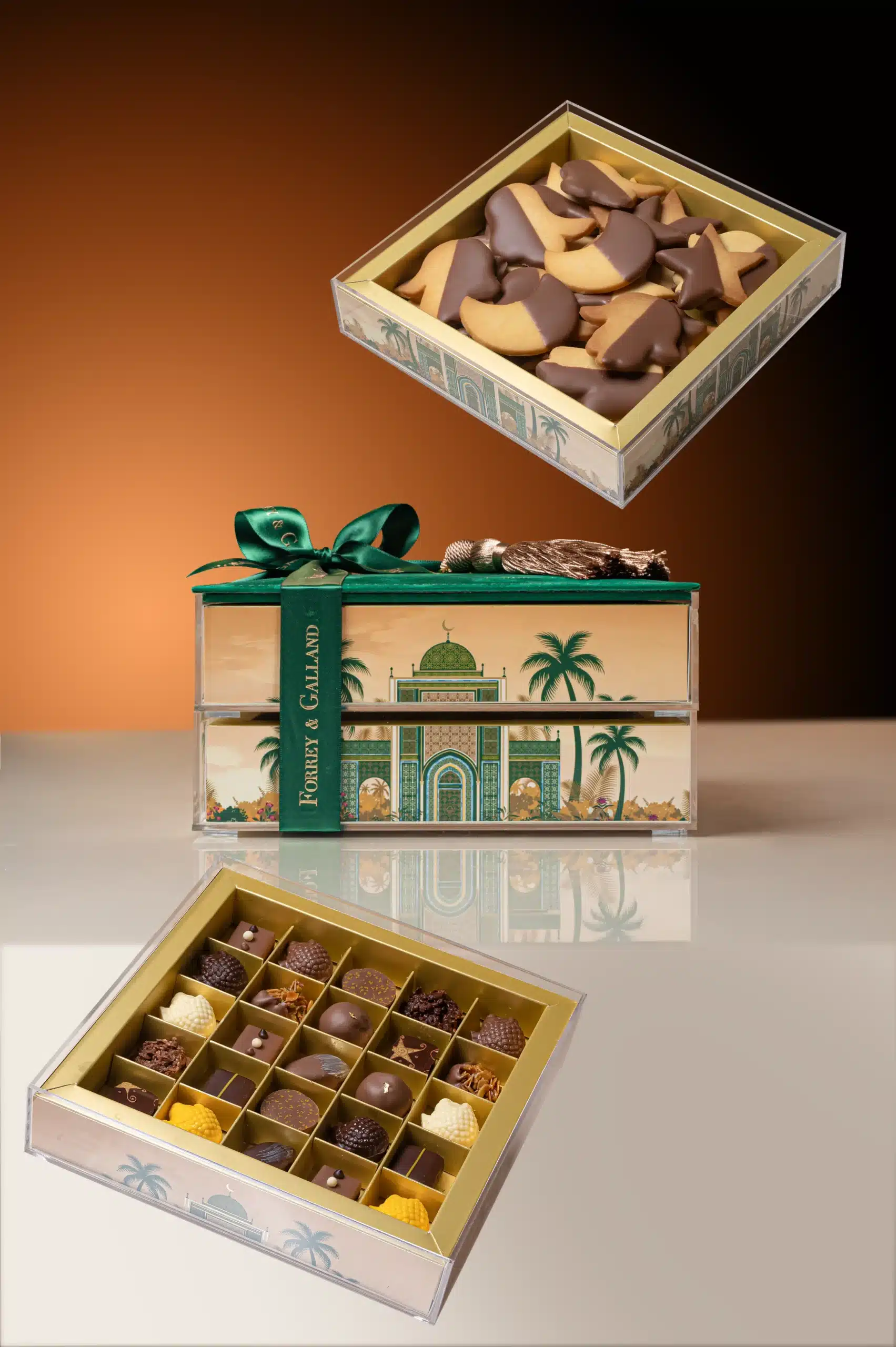 A grand three-layer box curated for generous gifting and elegant hosting. Bringing together artisanal chocolates, cookies, and Arabic sweets, it is designed as a statement centrepiece for the season. Customisable across 1, 2, or 3 layers, it offers a graceful balance of abundance and choice.