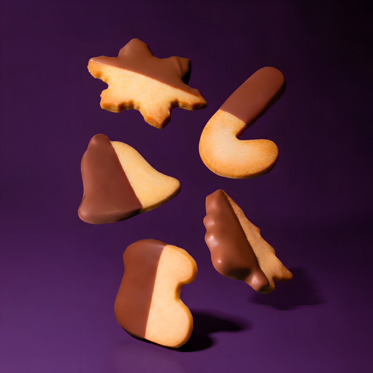 A refined assortment of buttery sablé cookies dipped halfway in milk and dark chocolate — an elegant gesture for sharing and gifting.
