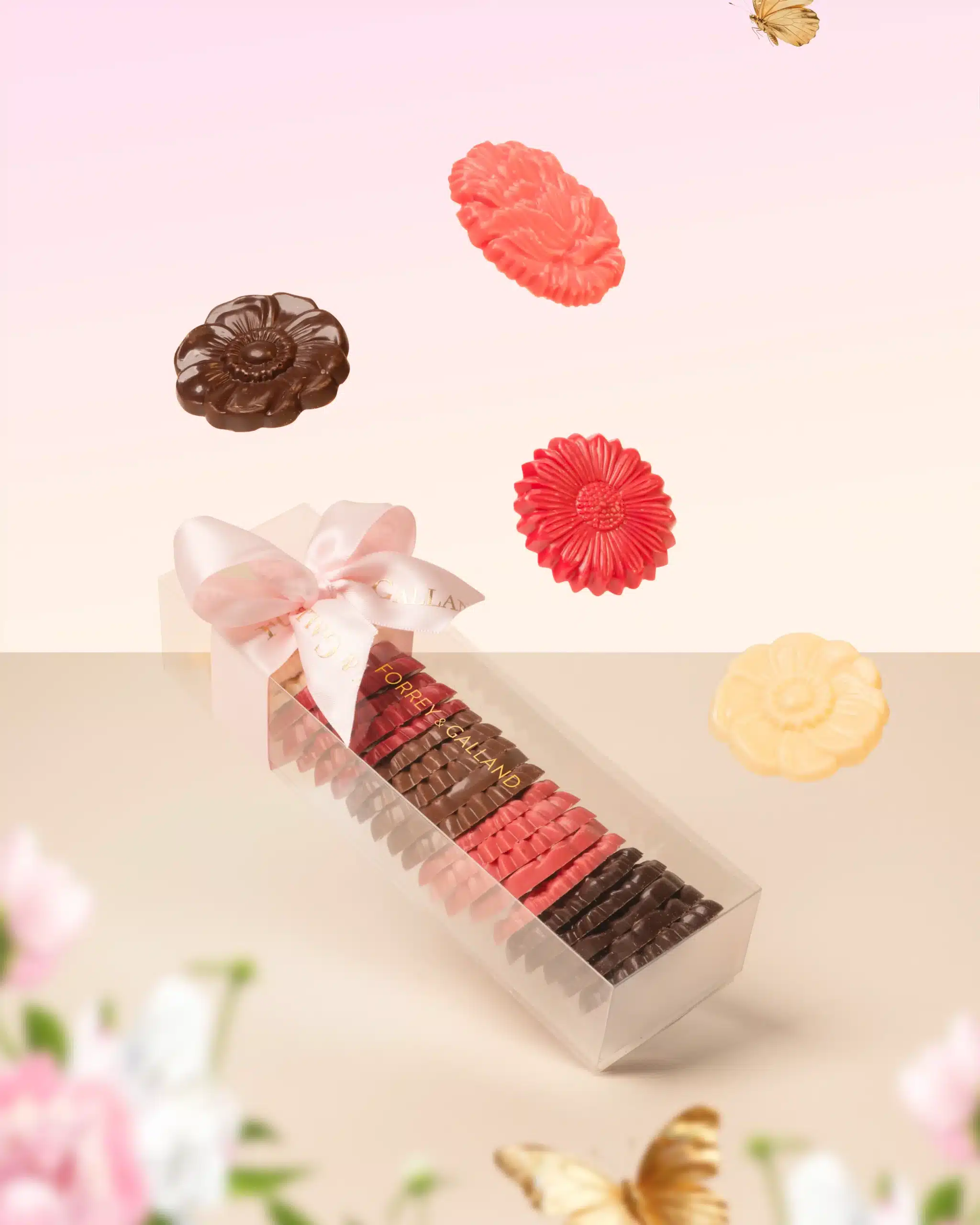 Heart chocolates with Passion fruit ganache, Vanilla ganache, Praline speculoos, Classic praline. Flower-shaped chocolates with vanilla and passion fruit ganache. Classic Dark Carré d’or, Dark Mint Praline, Milk Cappuccino, Milk Praline Speculoos, Crunchy Milk Praline, and Coffee Chocolates in milk and dark. Heart-shaped cookies finished with delicate royal icing.