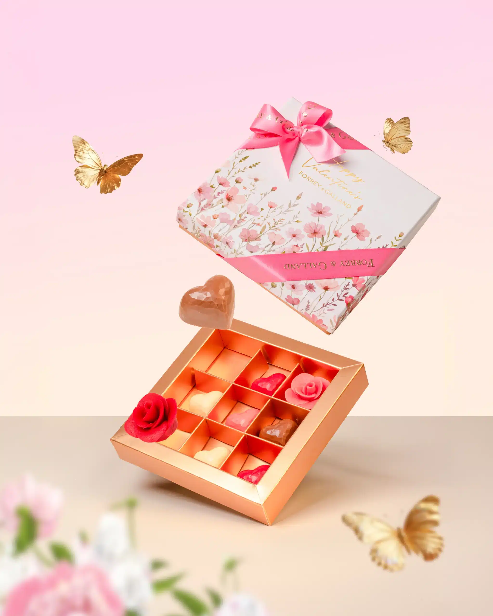 The Maison Coffret reveals a carefully composed journey across three distinct layers, each offering a different expression of flavour, texture, and craftsmanship. From sculpted chocolate hearts to signature pralines and vanilla sablé cookies, this coffret is designed for considered gifting and shared moments.