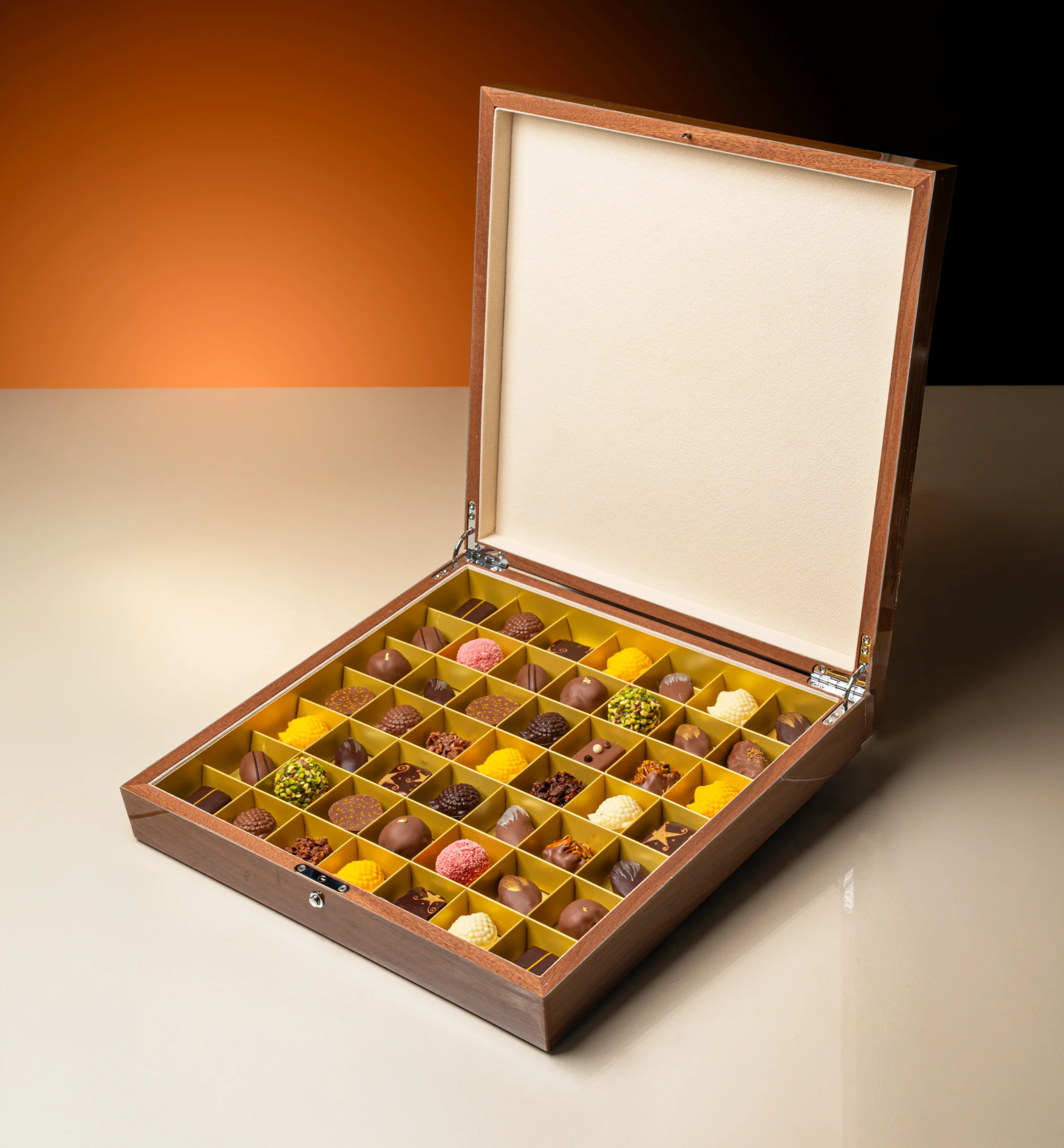 A generous two-layer drawer box featuring a refined selection of handcrafted chocolates, maamoul, Arabic sweets, half-dipped cookies, and creamy spreads. Thoughtfully composed for elegant gifting and festive sharing.