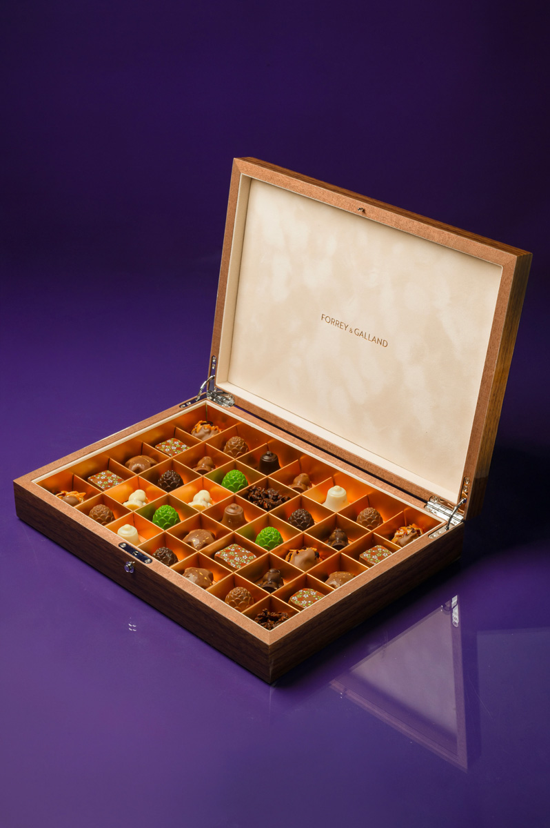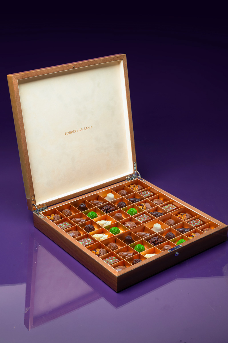 An elegant selection of handcrafted chocolates presented in a refined wooden box, celebrating the flavours of the season from silky pralines to rich truffles and festive ganaches. A timeless gift of taste and craftsmanship.