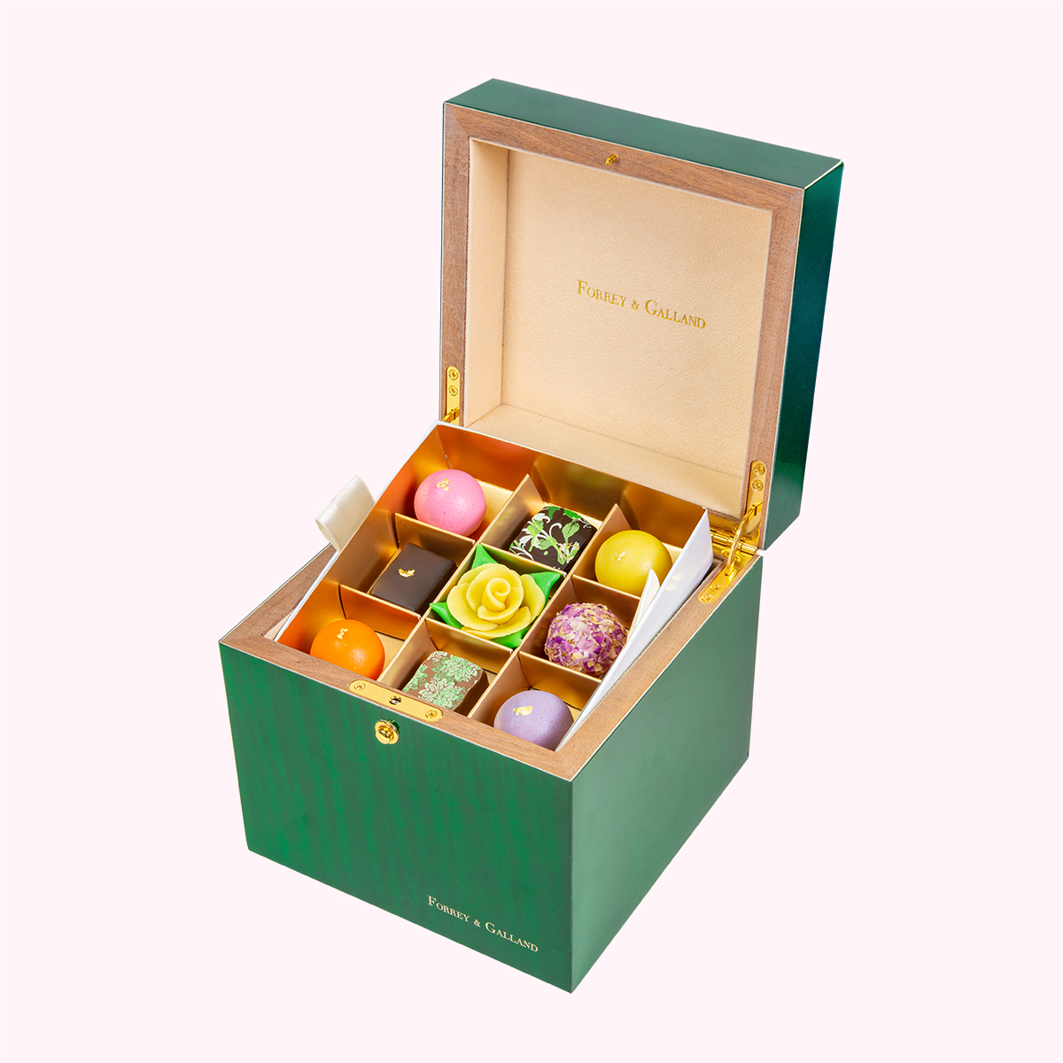 Opt for this sophisticated three-layered wooden lacquered box in an array of rich colours, filled with 27 pieces of handmade praline and ganache chocolates, rose truffles, marzipan flowers and praline truffles coated in a delicate layer of marzipan.